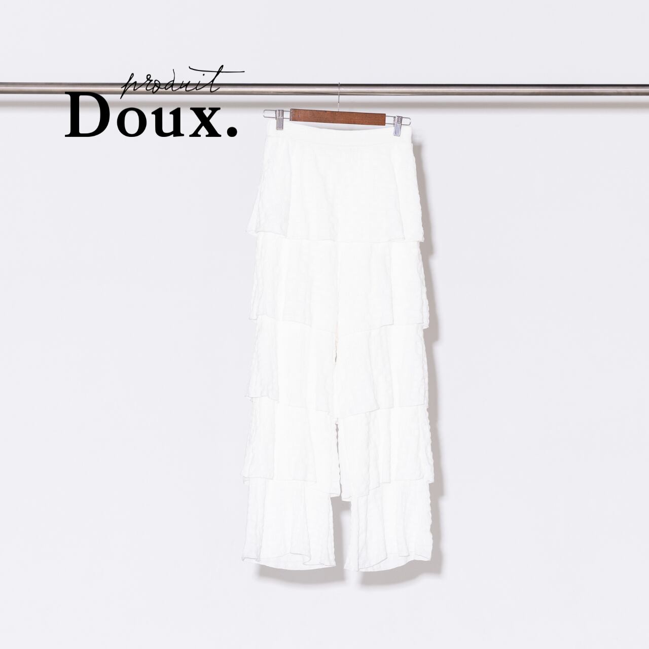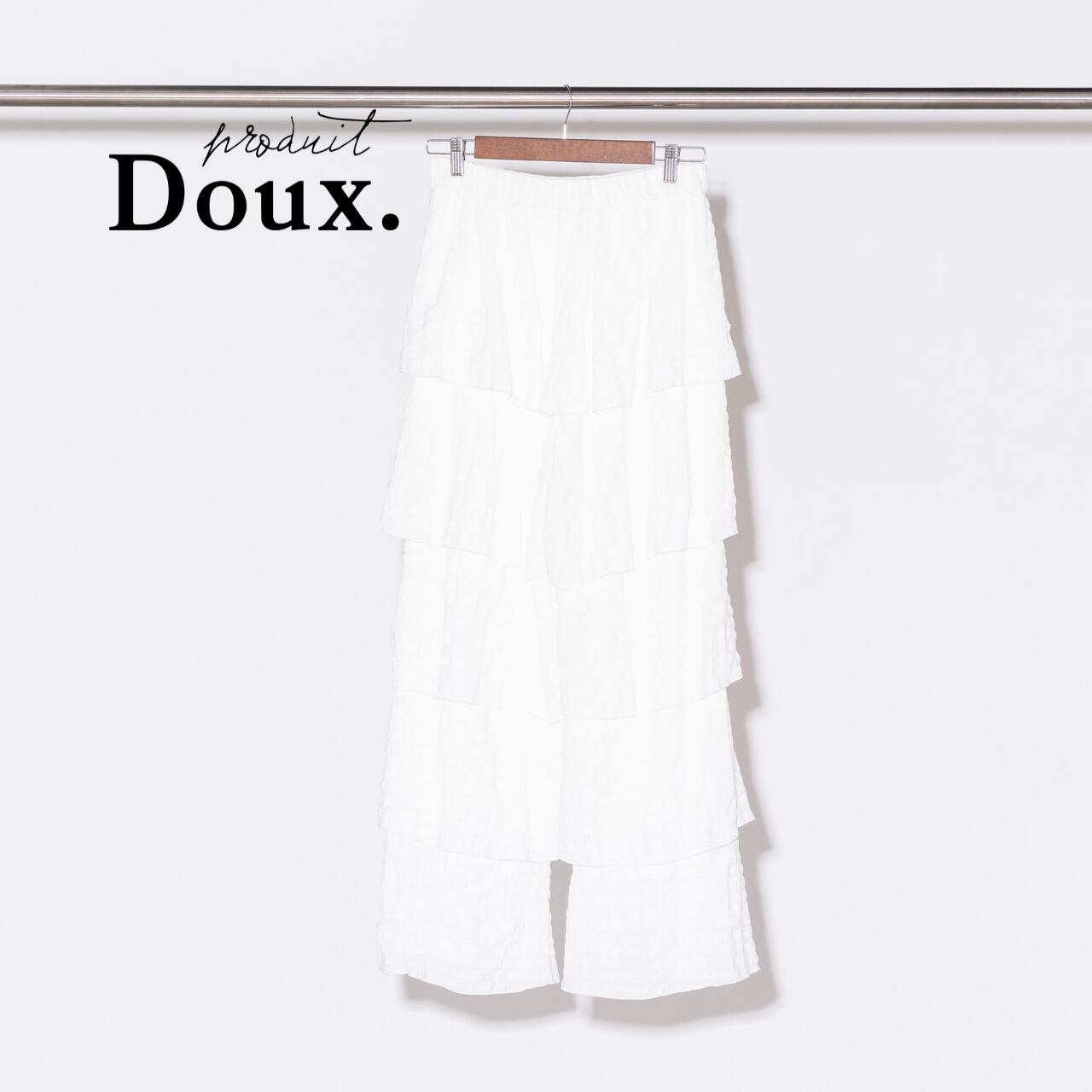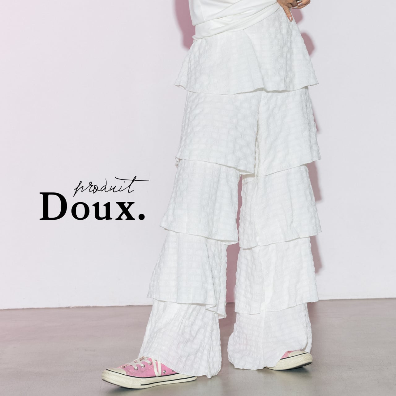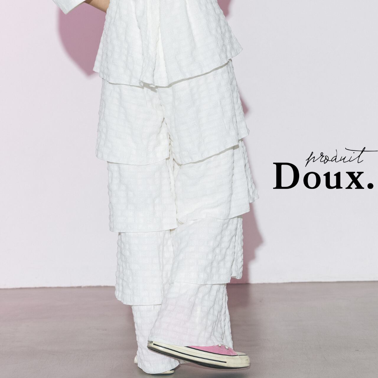 5段の柔らかなエンボス素材が特徴のティアードパンツ。